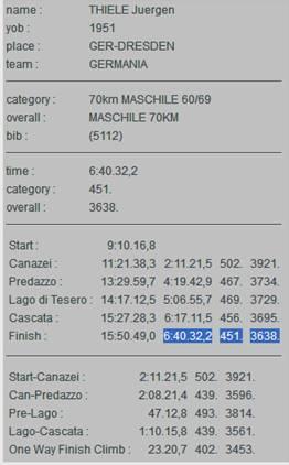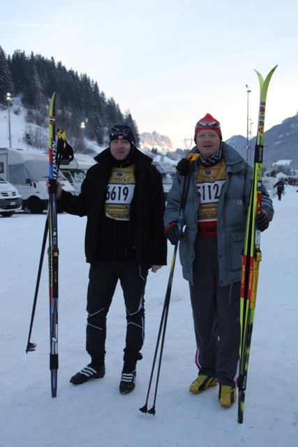 Der eigentliche Wettkampftag, Sonntag 27.01.2013, war für mich in diesem Jahr kein Stress. Ich wusste genau was auf mich zukommt und wollte den Lauf auch mehr genießen, als eine gute Zeit zu erkämpfen. Mit Startnummer 5112 auch sehr weit hinten gestartet, bin ich ganz locker bis zur oberen Wende in Canazei (1.400m NN) gelaufen. Umringt von ganz vielen „Nordländern“ (es waren 4.500 Norweger am Start) bin ich sauber und locker mitgelaufen. Sauber Skilaufen (Diagonal) das können heute nur noch wenige. Auf dem etwas schwierigen Stück bis Predazzo, wo es immer mal auf und ab geht hatte ich an vielen Passagen Glück. In den vielen Ortsdurchläufen war die mehlige Spur zum Teil eine Qual. Ich habe mich davon nicht stören lassen und habe die einmalige Atmosphäre genossen. Mein Training hatte ich in diesem Jahr ganz auf die letzten 30 km aufgebaut (viel Armkraft trainiert) und ich war topfit. Es macht auch Spaß wenn dich am Ende nur noch ganz wenige überholen und du aber gleichzeitig richtig Strecke machst. Alles in allem ein schöner Lauf für mich und am Ziel war der Adrenalinausstoß besonders groß. Auch mein „Spinningfreund“ Thomas hat den Lauf ohne große Probleme überstanden und so sind wir am Montag alle wieder glücklich nach Hause gefahren.