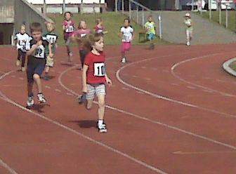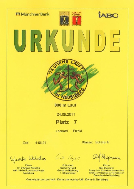 Leonard startete zwei (oder drei?) Altersklassen höher in der AK Schüler E(m) und wurde mit einer Urkunde und einem Preis für seinen 7.Platz belohnt. Als jüngster Teilnehmer lief er wacker an Frank's Hand über 800m ins Ziel.